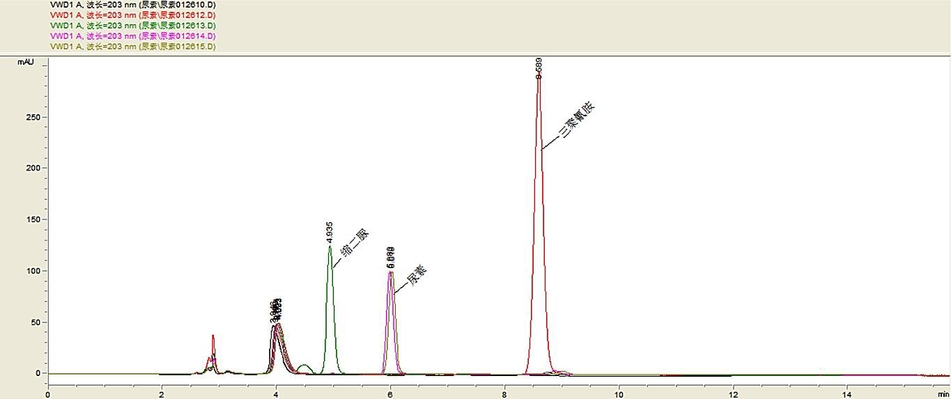 樣品濃度:尿素 1.5mg/mL;縮二脲 0.15mg/mL;三聚氰胺 0.015mg/mL.